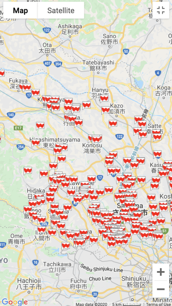埼玉県内の公共施設・図書館・バスターミナル・駅・案内板等で提供されている無料Wi-Fiスポットの地図。